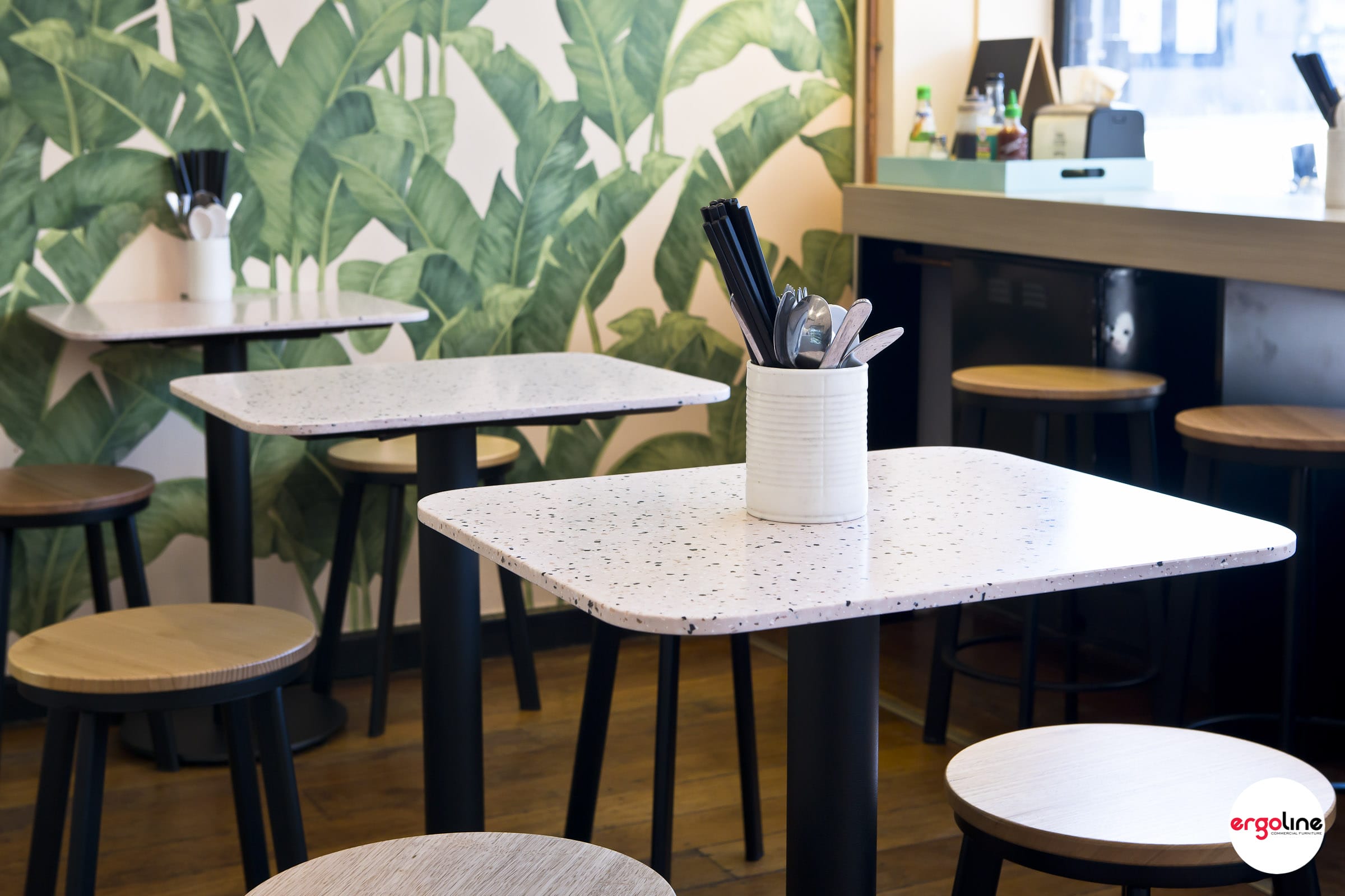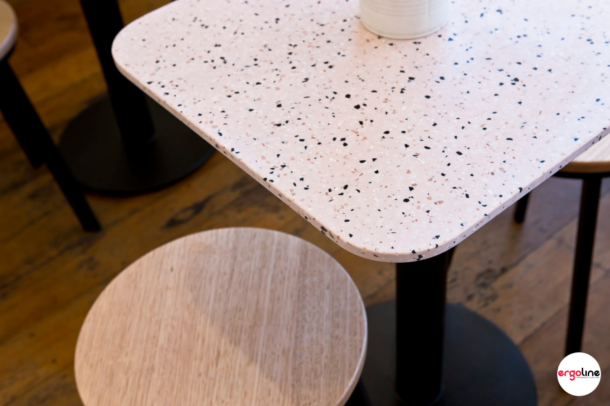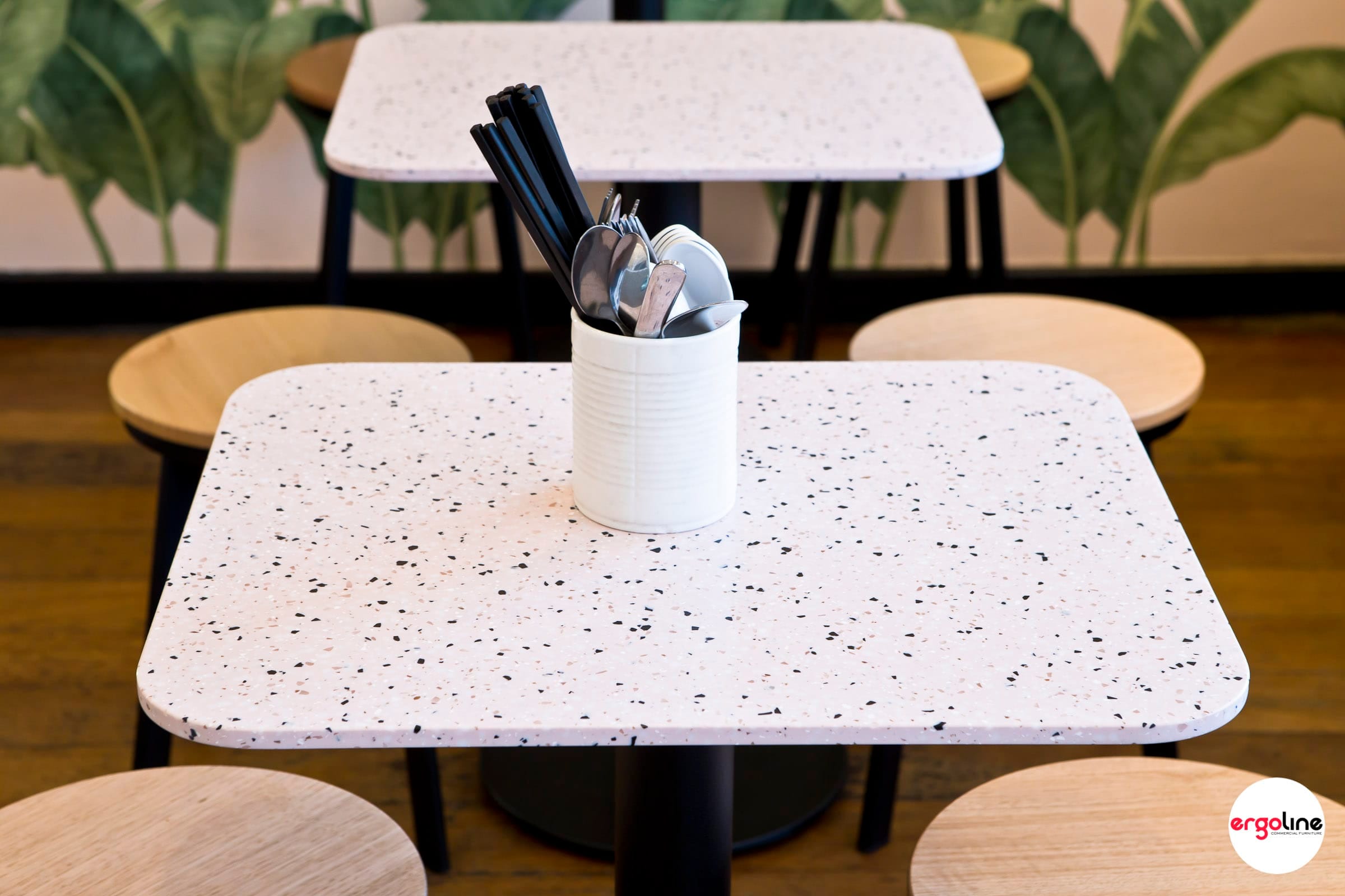 Three Sisters Vietnamese Tuckshop recently updated their internal furniture as selected by Tracy Zorich Interiors. Marblo terrazzo look table tops were used here to complement the existing interior colours. Max II range of low stools and high stools with Tassy Oak timber seats were selected for the casual seating vibe.