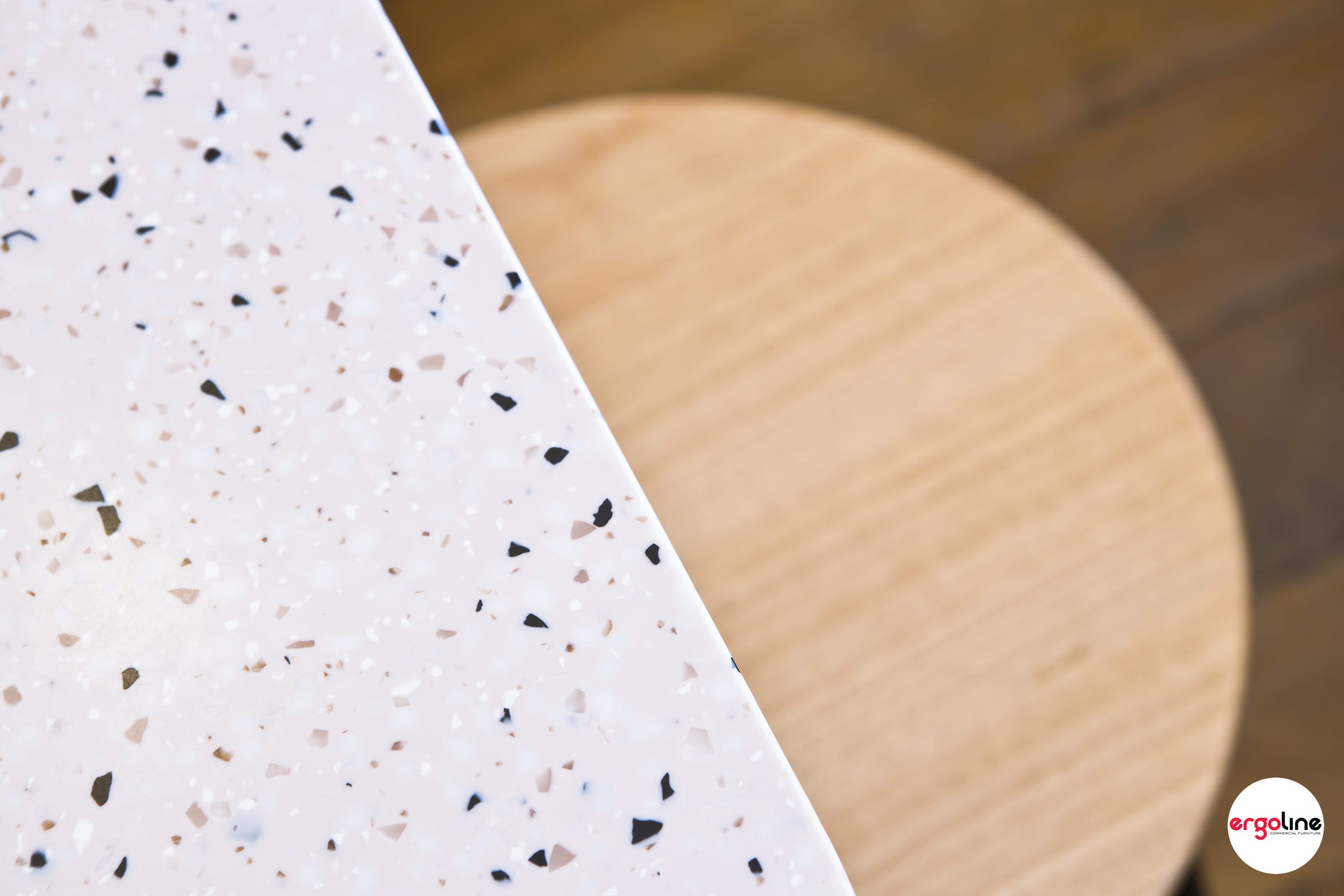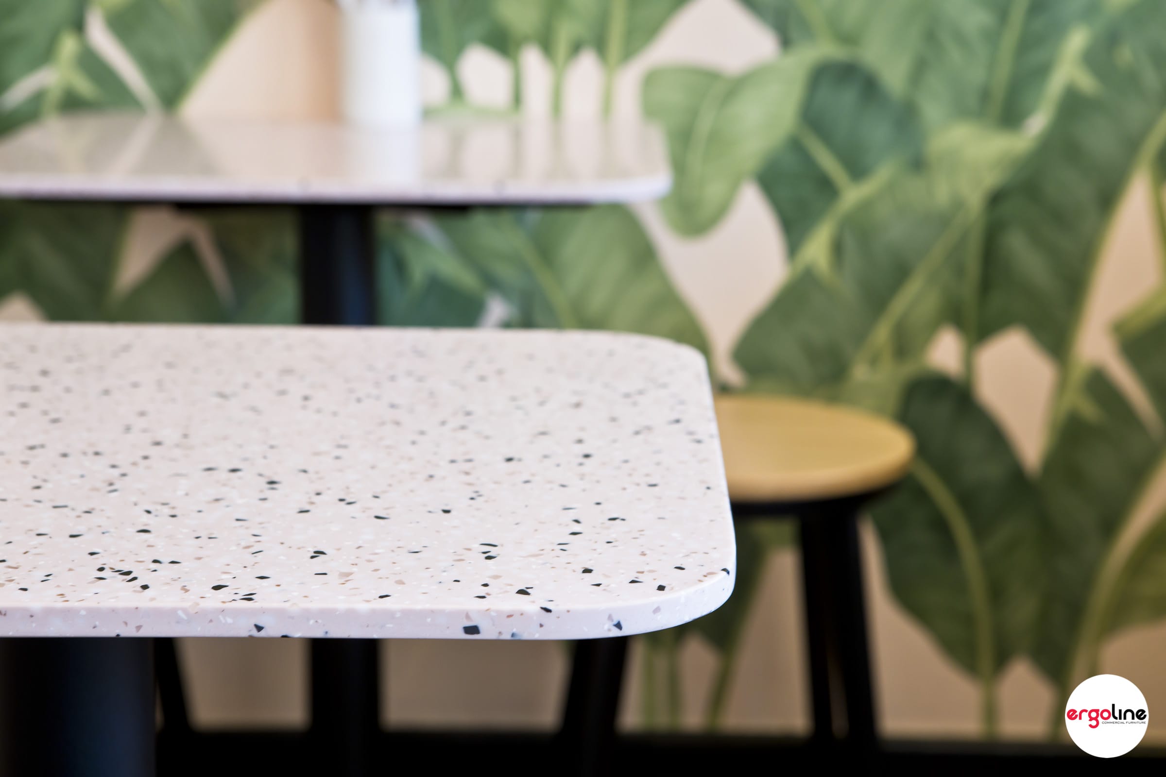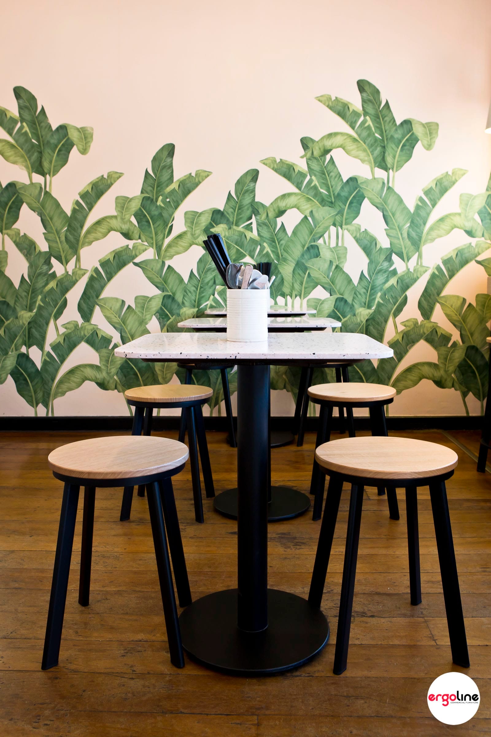 Three Sisters Vietnamese Tuckshop recently updated their internal furniture as selected by Tracy Zorich Interiors. Marblo terrazzo look table tops were used here to complement the existing interior colours. Max II range of low stools and high stools with Tassy Oak timber seats were selected for the casual seating vibe.