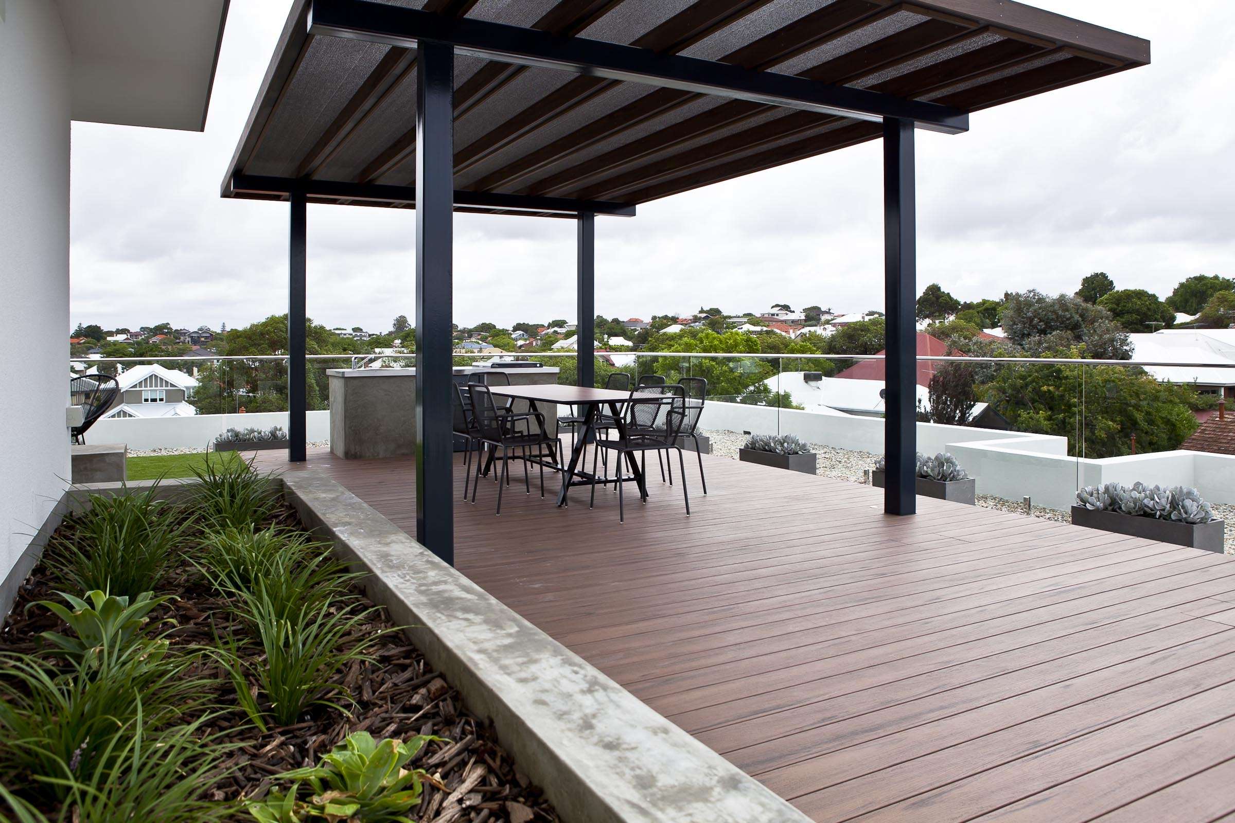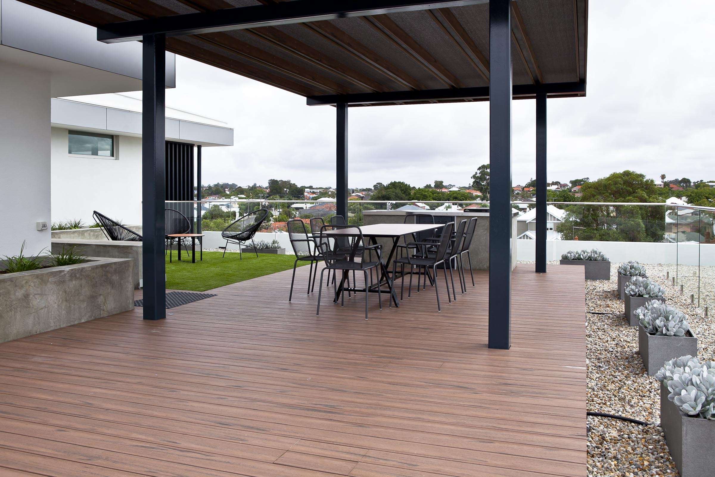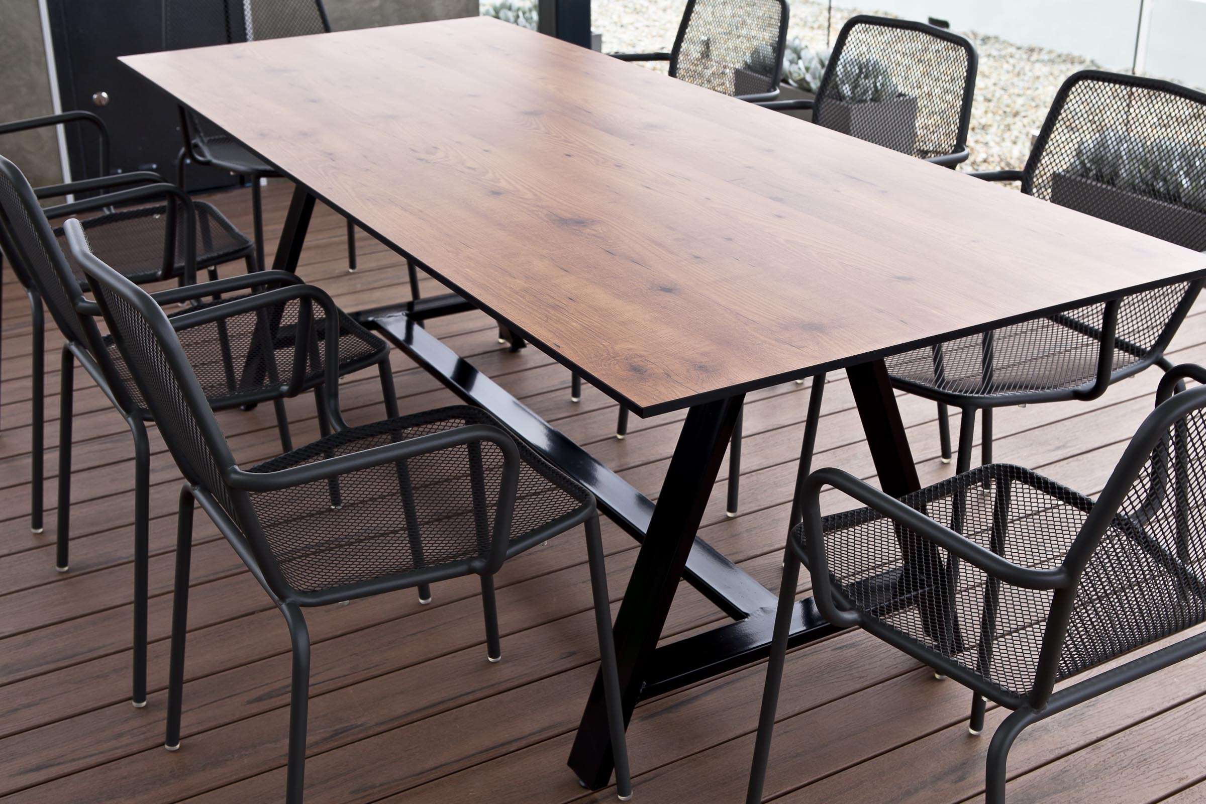 With that awesome Perth city views in mind, we immediately proposed the A-Frame communal dining table with Laminex Alfresco UV Brushed Beam compact laminate top to compliment the beautiful decking.