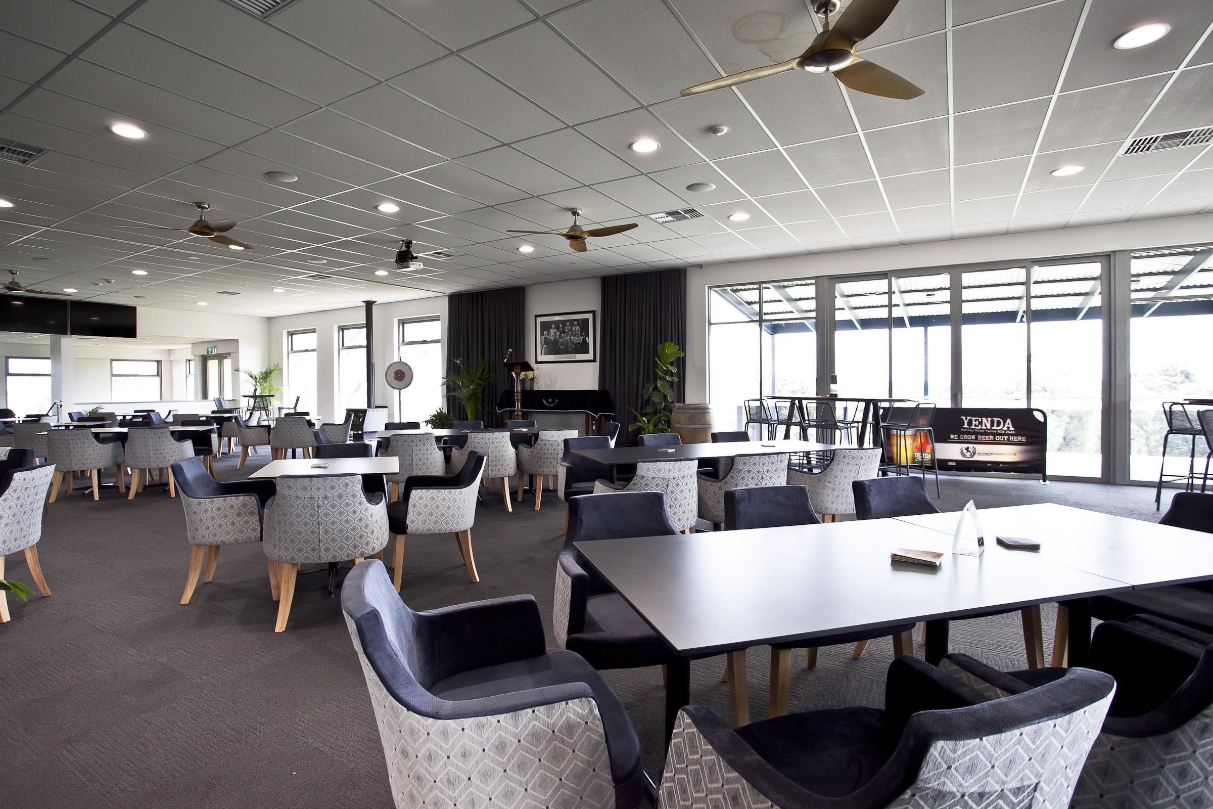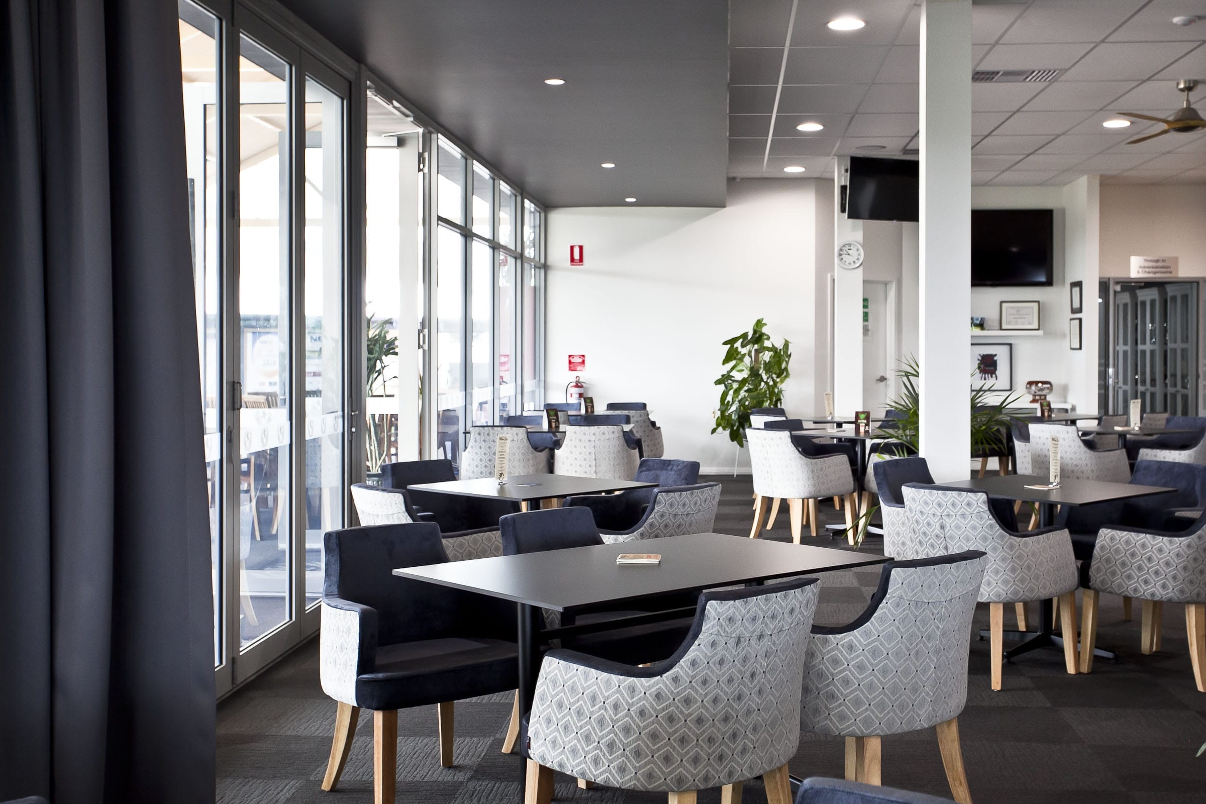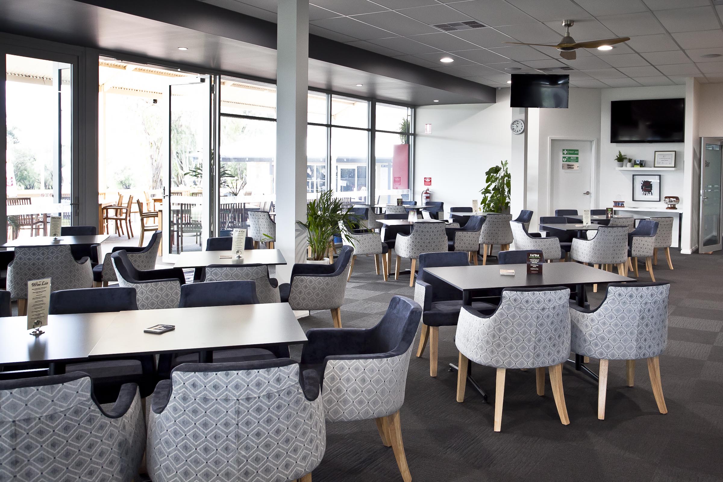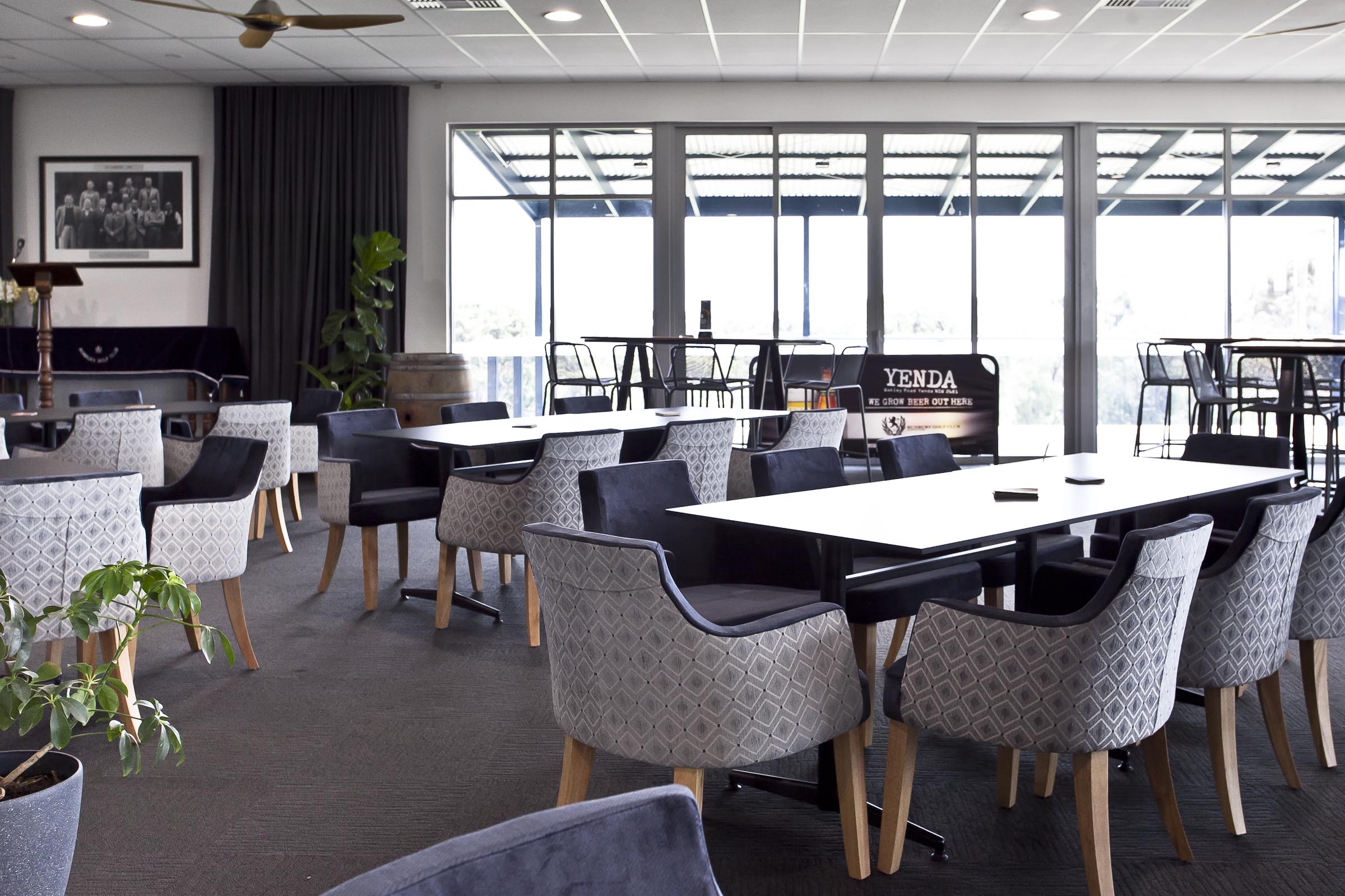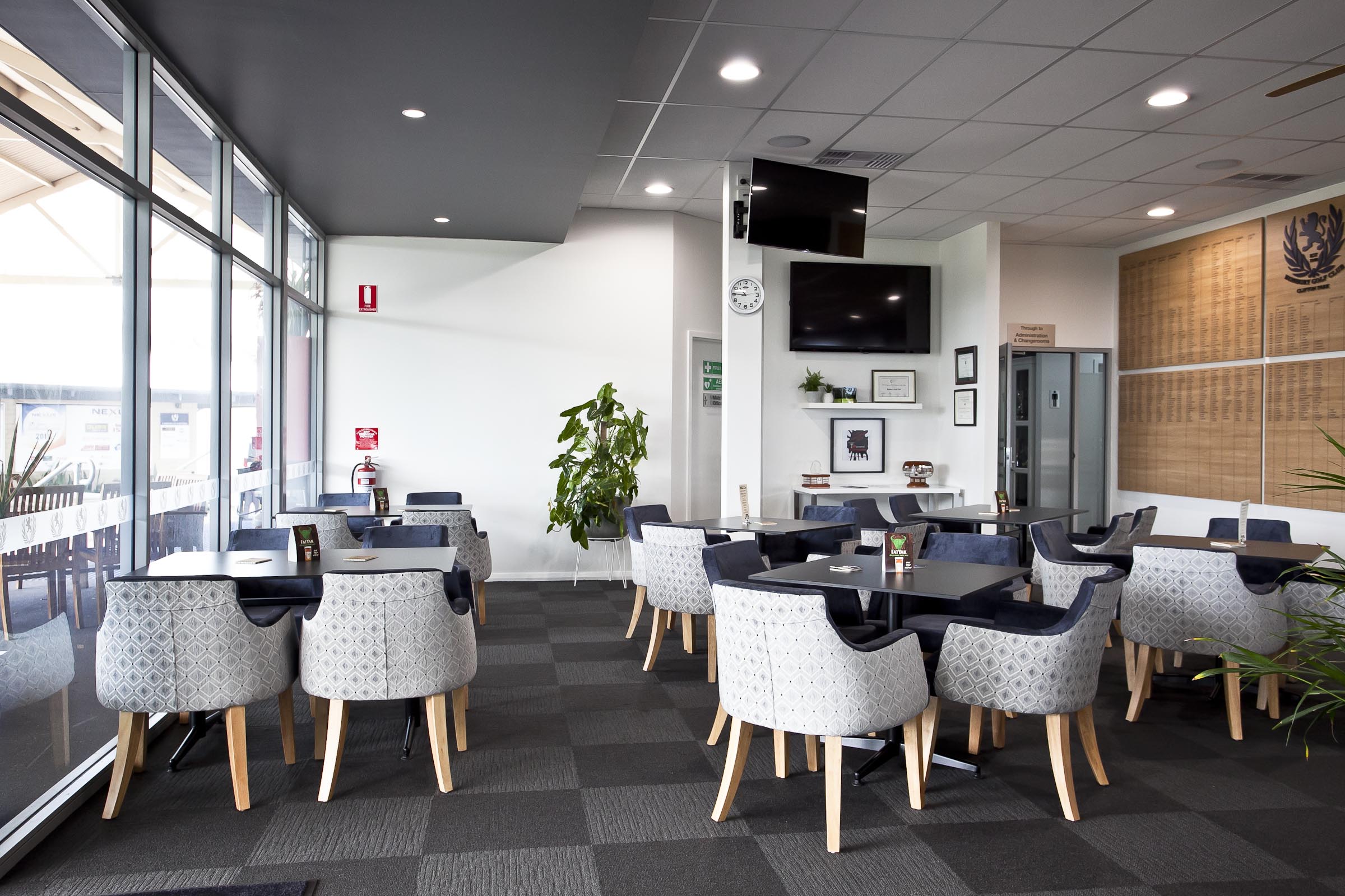Laminex compact laminate tops were used throughout the dining area. New the outer fringes of the club house, the Trevi bar stools in anthracite finish were selected, matched with the A-Frame bar tables for the regular punters.
