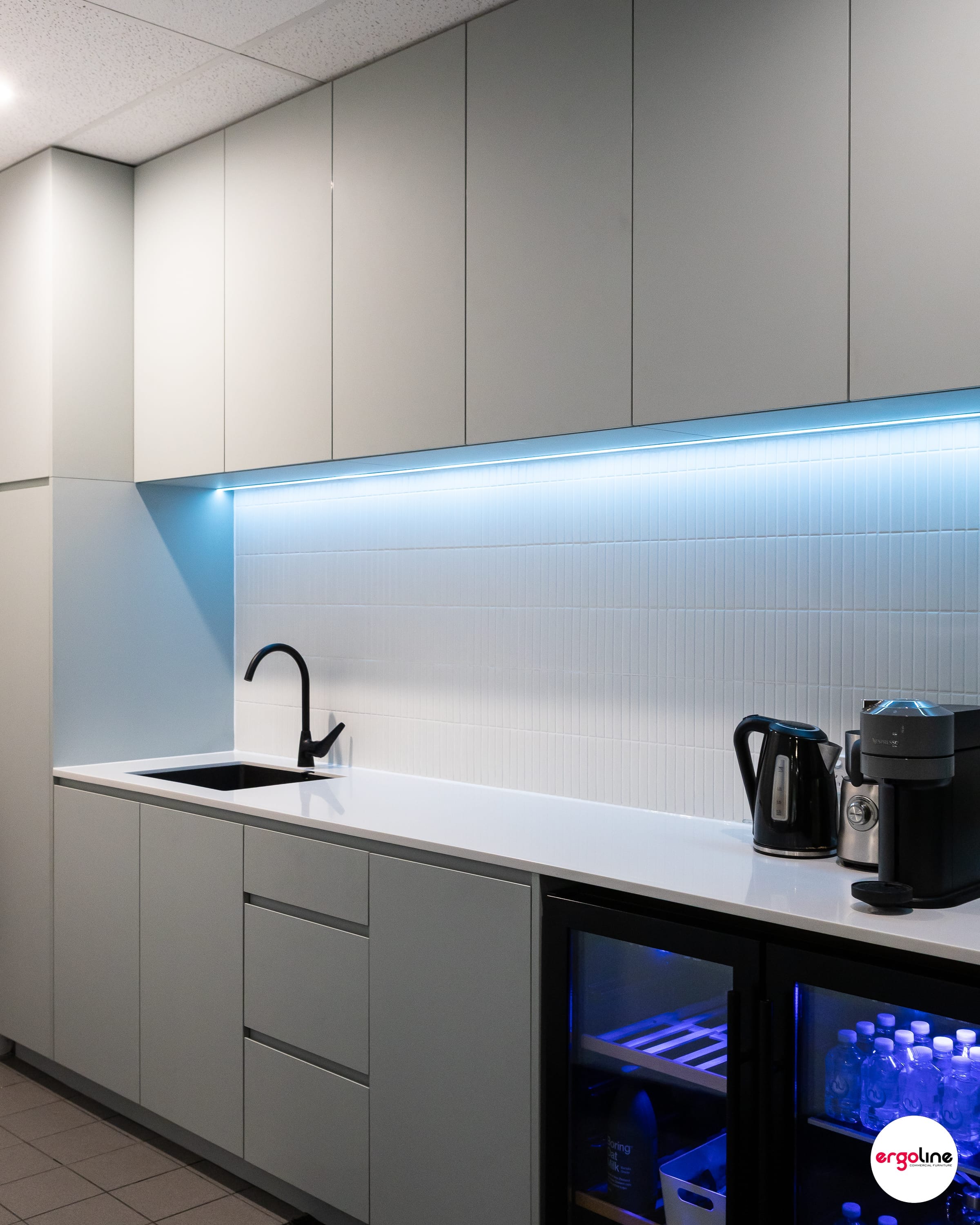 ‘The team at Ergoline were great to work with. They took the time to visit the space, understand the brief, and offer practical advice that helped with key decisions. Their flexibility and attention to detail, especially with the built-in server room and custom boardroom tables, made a real difference. The kitchenette had a high-end feel with perfect construction, including features like LED strip lighting—something I wouldn’t have even considered. Everything was done with care and professionalism, and I’d happily recommend them to anyone.’