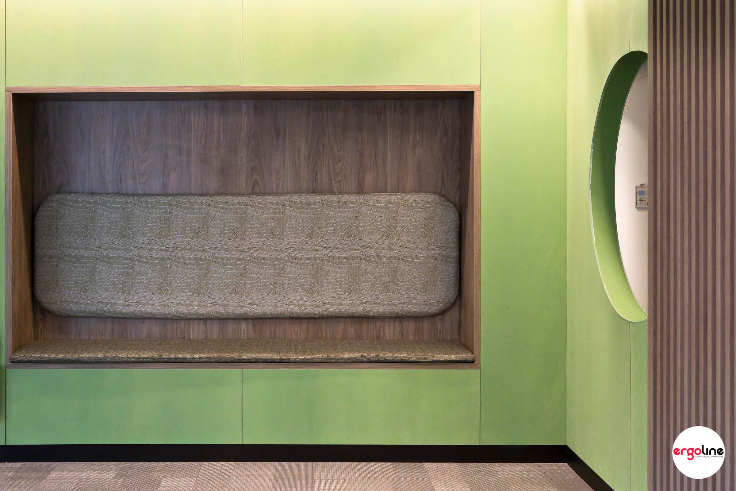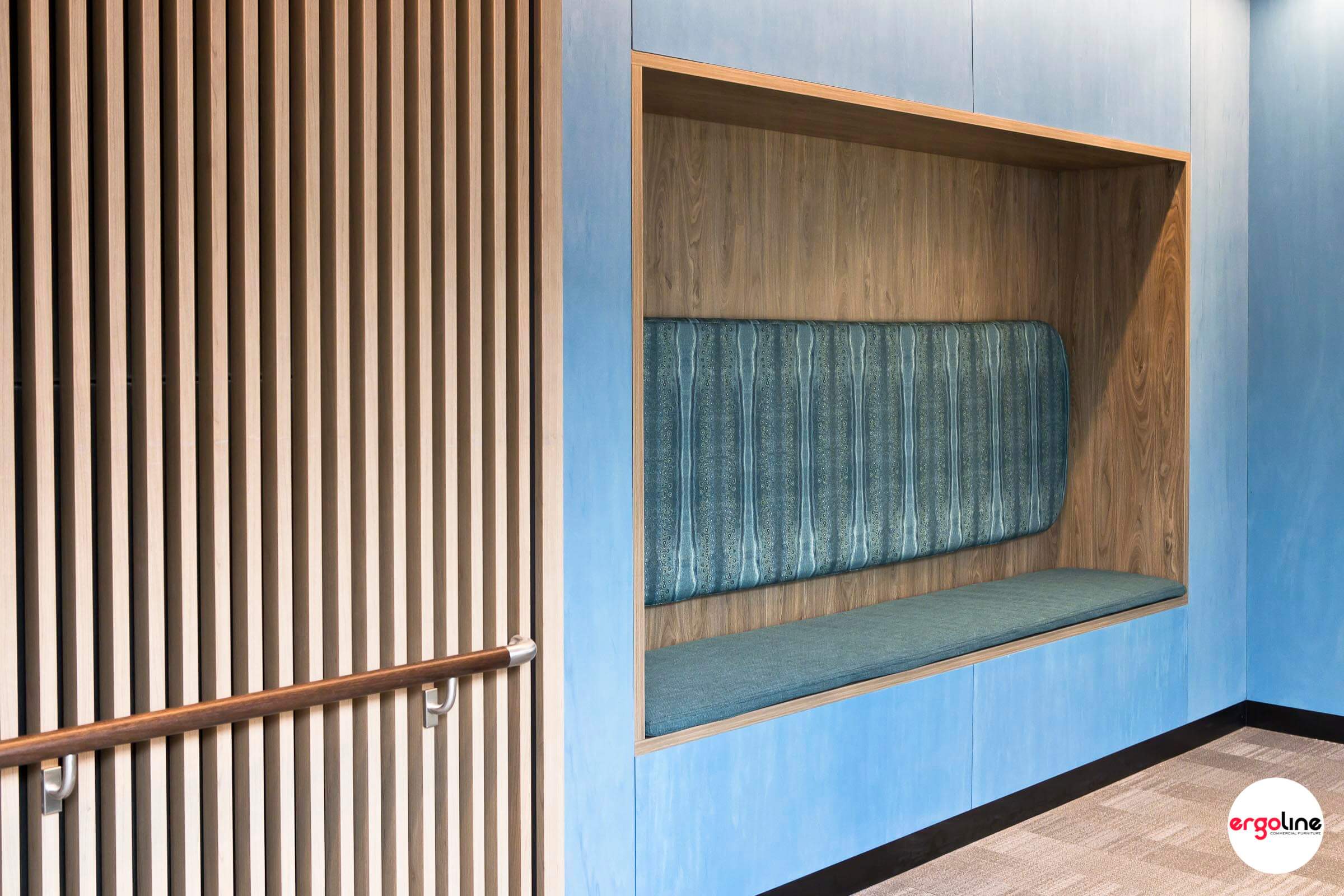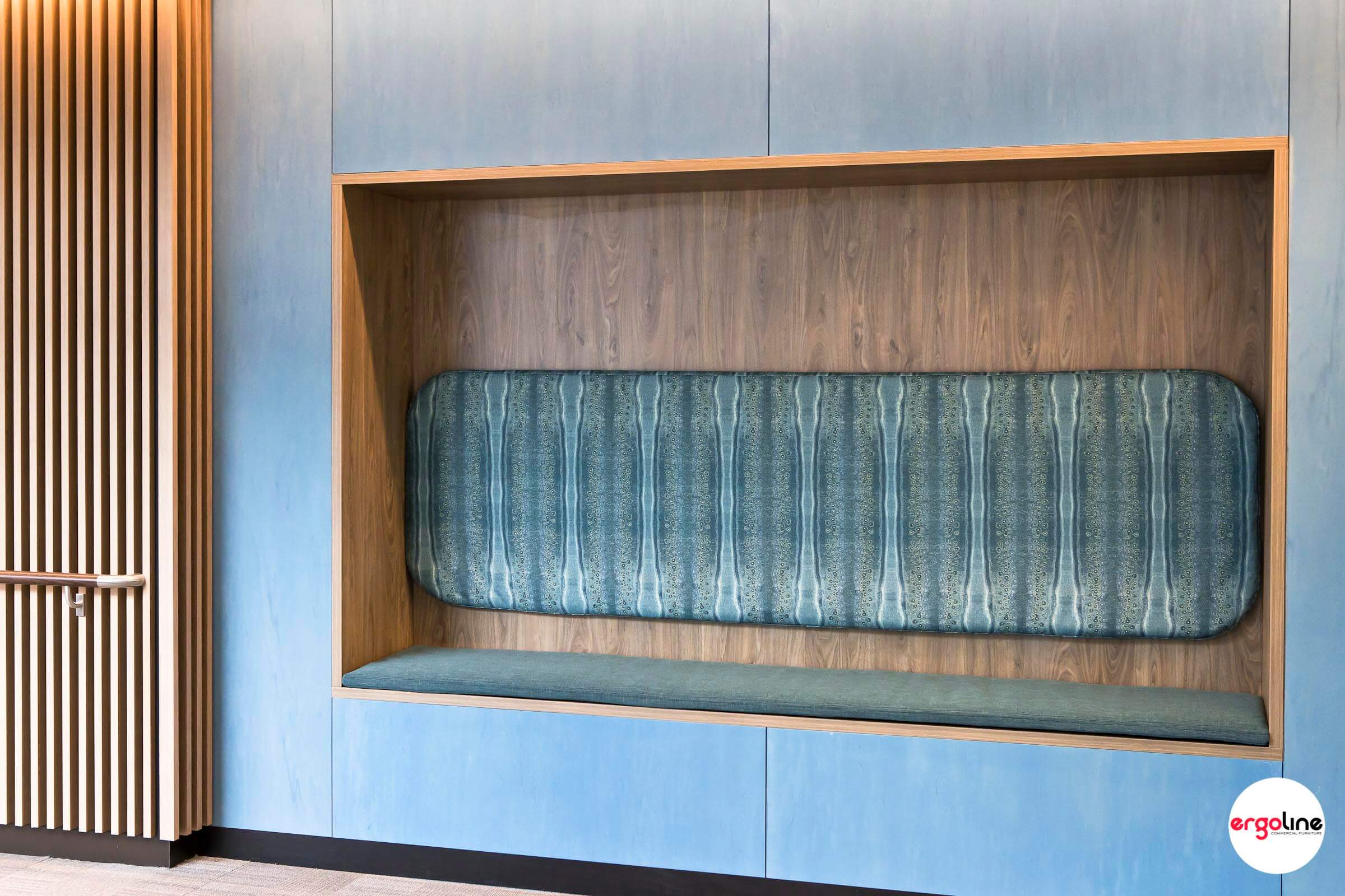 We were delighted to be working with De Fiddes Design with providing custom built in recess and seating for SWANCARE NINGANA in Bentley. Each level of the building has been furnished with different colour themes. We used Laminex Natural Walnut to build the recess complimented with the upholstery fabrics from Materialised, Woven Image and Maxwell Rogers.